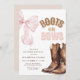 Celebre a antecipação do gênero do seu pequeno com nosso belo projeto Boots ou Arcos Tema Gender Reveal Invitation. Perfeito para uma festa de revelação de gênero no oeste ou no rodeio, este convite apresenta um belo arco rosa e um par de botas de vaqueiro simbolizando o clássico tema "Ele ou ela".