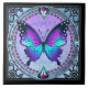 Uma borboleta vibrante com tons de azul e roxo é centrada dentro de um design circular ornamentado, cercada por intrincados padrões florais e joias decorativas. A composição total expele uma estética de vidro manchado com uma mistura harmoniosa de cores e simetria.