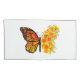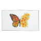 Borboleta de monarca laranja com asa decorada com papoila amarela e vibrante da Califórnia em fundo branco.