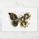 Borboleta de flores Dourada com orquídea de joias pretas, decorada com folhas de ouro sobre fundo branco.