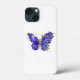 Borboleta de flores cinza, azul, safira, espumante com asa decorada com flores preciosos azuis com folhas de ouro sobre fundo branco.