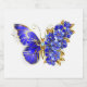 Borboleta de flores cinza, azul, safira, espumante com asa decorada com flores preciosos azuis com folhas de ouro sobre fundo branco.