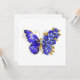Borboleta de flores cinza, azul, safira, espumante com asa decorada com flores preciosos azuis com folhas de ouro sobre fundo branco.