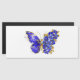 Borboleta de flores cinza, azul, safira, espumante com asa decorada com flores preciosos azuis com folhas de ouro sobre fundo branco.