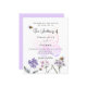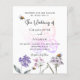Um fundo branco. Decorado com abelhas, pintado flores silvestres em violeta, rosa e uma borboleta grande. Personalize e adicione seus nomes e detalhes.