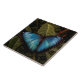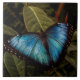 A borboleta Blue Morpho mostra suas brilhantes asas azuis ( 5 - 8 polegadas de extensão) enquanto repousa na folhagem na Maravilha da Borboleta. Foto de Ruth Jolly.