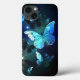 Fabulosa, brilhante, azul e amarela, borboleta noturna sobre fundo escuro.
