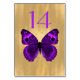 Placa de número de tabela de recepção de casamento de tom ouro elegante com gráficos de uma borboleta roxa. Personalize o número roxo de cada mesa na sua recepção.