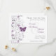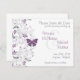 Esta elegante e romântica salvação da data convite design apresenta uma ramificação de cinza floral roxa com borboleta roxa. O texto é em cinzas com os nomes da noiva e do noivo numa cor roxa coordenadora para combinar a borboleta com as flores. (Esse roxo também pode ser chamado de orquídea, violeta ou uva.) Isso seria bom para um casamento no final do verão ou do outono ou poderia ser personalizado em um convite de festas ou chá de panela de aniversário.
