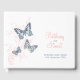 Lindas borboletas de arte com tinta e livro de hóspedes gráfico floral de hóspedes de casamento em cor rosa-laranja-coral, creme, azul-céu e azul-escuro. Personalize com seus próprios nomes e data de casamento. Tinta original de borboleta esboçada e design gráfica por Sarah Trett para www.mylittleedenweddings.com