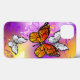 Laranja, borboletas monarcas detalhadas sobre luz, roxo, pitoresco, fundo pintado.