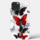 Bando de borboletas voadoras, realistas, vermelhas e pretas em fundo branco com gotas de tinta.