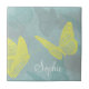 Um padrão bonito de borboleta amarela sobre um fundo de folhagem de cinza azul. Personalizado com seu nome em um script branco de tendência.