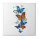 Borboleta azul-clara e voadora morfo e borboleta-monarca laranja num fundo branco. Morpho. Borboleta monarca. Design com borboletas.