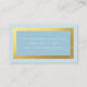 (NOTA: não se trata de folha de ouro real, trata-se de uma imagem impressa).Um modelo de cartão de negócios sofisticado com "folha de alumínio" dourada e borda sutil do diafrão e fundo azul claro. Texto branco. A cor de fundo (azul) é personalizável. Clique em "Personalizar" e use as amostras à direita para alterar a cor de fundo. A ferramenta conta-gotas fornece ainda mais amostras, e o link "avançado" abre todo o espectro. Você também pode copiar e colar um valor hexadecimal se tiver um. Excelente para as indústrias da moda e do fazer do paladar; planejadores de eventos, designers de interiores, cabeleireiros, maquiadores e muito mais. Por favor, entre em contato comigo se quiser um cartão de visita correspondente