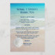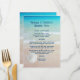 Modelo de cardápio de casamento com fundo de praia e dólar de areia branca. Há um script em negrito no topo para um título que pode incluir os nomes do casal. Todos os itens de menu estão listados no formulário de parágrafo para que você possa decidir como deseja que ele seja. O menu de amostra é dividido em seções para aperitivos, entrenes e sobremesas. A parte de trás do papel tem a mesma cena de praia sem o dólar da areia.