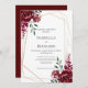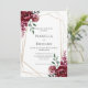 Convite de casamento personalizável em branco limpo. Possui buquês florais bonito em tons vermelhos burgundy marsala, muito ricos, com uma estrutura geométrica de ouro moderna.