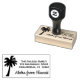 Este selo de borracha de endereço tropical personalizado e divertido tem uma silhueta de uma palmeira de coco. Diz Aloha do Havaí e um nome de exemplo. — Adicione seu nome e endereço na modelo para personalizar. Você pode alterar o estilo da fonte se quiser. Clique no botão personalizar ou personalizar. Talvez seja necessário ajustar o tamanho das letras para o ajustado. — Você pode mudar as palavras no carimbo se quiser, ou mover as coisas. Isso também está disponível em carimbos redondos e autopicantes. — Mande saudações havaianas da praia ou de sua casa. Você pode usá-lo se você vive em um lugar tropical ou perto do oceano, ou se você vai de férias para um lugar quente e balnear. — Veja os selos de borracha do retorna caprichoso no Lápis de Alina.