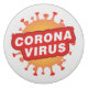 Texto do CoronaVirus, em cor branca, laranja e vermelha, impresso no apagador redondo, com o Design do logotipo Corona Virus 2020 ou Covid 19, das bactérias Covid19, estrutura de células proteicas