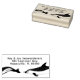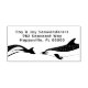 Carimbo de borracha de endereço de retorno de golfinhos. Carimbo longo e fino funciona bem para o verso de envelopes. O desenho é de dois golfinhos - a cauda de um e a cabeça e a maior parte do corpo do outro - nadando abaixo do texto. Fonte impressa pequena com espaço para apenas três linhas.