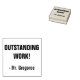Este design de carimbo positivo apresenta a mensagem inspiracional "OUTSTANDING WORK!" e um nome de tutor personalizado. Ele poderia ser usado por um professor, educador, ou tutor ao marcar tarefas, para reconhecer que um aluno fez bem.