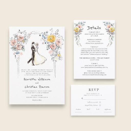 Delicate botanical sketch of wildflowers adorns this wedding dinner menu, featuring a soft watercolor palette. The artistic illustration brings a natural and romantic feel to your table setting. This menu is ideal for garden weddings, rustic celebrations, or any event seeking a touch of organic beauty. Showcase your carefully curated meal with this charming design.