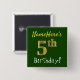 Este design de botão quadrado simples apresenta uma mensagem como "NameHere's 5 Birthday!", com o "5" a ter um aspecto de cor dourada falso/imitado, num fundo de cor verde. O nome pode ser personalizado. Botões como esses talvez pudessem ser vestidos por convidados numa festa de aniversário para alguém que comemora seu quinto aniversário, onde a festa está em uma grande área com muitas outras pessoas presentes (como um parque urbano ou um parque temático). [~Z0000163]