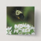 Uma fotografia linda e próxima da natureza, em detalhes espantosos, de uma abelha deslumbrante em voo enquanto voa para longe das deliciosas flores brancas de chive de alho em primeiro plano. Uma nova decoração de verão que é útil e adiciona um toque adorável ao seu armário, parede cúbica ou geladeira.