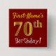 Este simples design de botão quadrado apresenta uma mensagem como "Aniversário do 70 do Primeiro Nome!", com o "70" a ter um aspecto de cor dourada falsa/imitação, num fundo de cor vermelha. O nome pode ser personalizado. Botões como estes talvez pudessem ser vestidos por convidados numa festa de aniversário para alguém que comemora seu setuagésimo aniversário, onde a festa está sendo realizada em uma grande área com muitas outras pessoas presentes (como um parque urbano ou um parque temático). [~Z0000163]