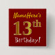 Este simples design de botão quadrado apresenta uma mensagem como "NameHere's 13 Birthday!", com o "13" a ter um aspecto de cor dourada falso/imitado, num fundo de cor vermelha. O nome pode ser personalizado. Botões como estes talvez pudessem ser vestidos por convidados numa festa de aniversário para alguém que comemora seu décimo terceiro aniversário, onde a festa está sendo realizada em uma grande área com muitas outras pessoas presentes (como um parque urbano ou um parque temático). [~Z0000163]