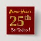 Este simples design de botão quadrado apresenta uma mensagem como "Name-Here's 25 Birthday!", com o "25" a ter um aspecto de cor dourada falso/imitado, num fundo de cor vermelha. O nome pode ser personalizado. Botões como estes talvez pudessem ser vestidos por convidados numa festa de aniversário para alguém que comemora seus vinte e cinco anos de aniversário, onde a festa está sendo realizada em uma grande área com muitas outras pessoas presentes (como um parque urbano ou um parque temático). [~Z0000163]