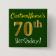 Este simples design de botão quadrado apresenta uma mensagem como "CustomName’s 70 Birthday!", com o "70" a ter um aspecto de cor dourada falsa/imitação, num fundo de cor verde. O nome pode ser personalizado. Botões como estes talvez pudessem ser vestidos por convidados numa festa de aniversário para alguém que comemora seu setuagésimo aniversário, onde a festa está sendo realizada em uma grande área com muitas outras pessoas presentes (como um parque urbano ou um parque temático). [~Z0000163]