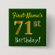 Este simples design de botão quadrado apresenta uma mensagem como "First-Name’s 71rua Birthday!", com a "71ruas" a ter um aspecto de cor dourada falsa/imitação, num fundo de cor verde. O nome pode ser personalizado. Botões como esses talvez pudessem ser vestidos por convidados numa festa de aniversário para alguém que comemora seus setenta anos, onde a festa está sendo realizada em uma grande área com muitas outras pessoas presentes (como um parque urbano ou um parque temático). [~Z0000163]