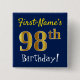 As características deste design quadradas simples do botão uma mensagem gostam do "aniversário nome do 98th! ", com "98th" tendo o falso/imitação ouro-como o olhar da coloração, em um fundo colorido azul. O nome pode ser personalizado. Os botões como estes poderiam talvez ser vestidos por convidados em uma festa de aniversário para alguém que está comemorando seu ninety oitavos aniversários, onde o partido está sendo realizado em uma grande área com lotes de outras pessoas atuais (como um parque da cidade ou um parque temático). [~Z0000164]