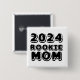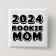 2024 Botão Rookie Mamãe com texto preto para a primeira vez que o mães for lançado.