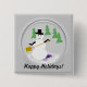 Snowman está a enfiar a neve vestindo o chapéu de cima. Pinheiros estão no fundo. O globo 3d destaca-se contra a cinza do botão. "Felizes Feriados" está escrito abaixo.