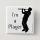 Eu sou um Pino do Jogador Clarinetista que mostra nossa arte digital original em preto e branco de um jovem tocando saxofone em silhueta com as palavras "Eu sou um Jogador" em um tipo divertido à esquerda. Esta arte musical divertida criada por Traci Van Wagoner faz um presente perfeito para clarinetistas, músicos e qualquer pessoa que ama música, ama o clarinete e adora se divertir. Vá em frente, seja um jogador.