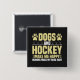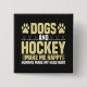 Botão do tema do hóquei com texto que lê Cachorros e Hockey Me Faz Feliz Humans Faz Minha Cabeça Magoar! Também mostra alguns bastões de hóquei e estampas de pata de cachorro!