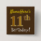 Este simples design de botão quadrado apresenta uma mensagem como "NameHere's 11 Birthday!", com o "11" a ter um aspecto de cor dourada falso/imitado, num fundo de cor castanha. O nome pode ser personalizado. Botões como estes talvez pudessem ser vestidos por convidados numa festa de aniversário para alguém que comemora seu décimo primeiro aniversário, onde a festa está sendo realizada em uma grande área com muitas outras pessoas presentes (como um parque urbano ou um parque temático). [~Z0000165]