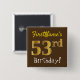 Este simples design de botão quadrado apresenta uma mensagem como "53º Aniversário do Primeiro Nome!", com o "53º" a ter uma aparência falsa/imitada de cor dourada, sobre um fundo castanho. O nome pode ser personalizado. Botões como esses talvez pudessem ser vestidos por convidados numa festa de aniversário para alguém que comemora seus cinquenta e três anos, onde a festa está sendo realizada em uma grande área com muitas outras pessoas presentes (como um parque urbano ou um parque temático). [~Z0000165]