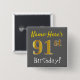 Este simples design de botão quadrado apresenta uma mensagem como "Name-Here's 91rua Birthday!", com a "91ruas" a ter um aspecto de cor dourada falso/imitação, sobre um fundo de cor cinza (cinza). O nome pode ser personalizado. Botões como estes talvez pudessem ser vestidos por convidados numa festa de aniversário para alguém que comemora o seu 90º aniversário, onde a festa se realiza numa grande área com muitas outras pessoas presentes (como um parque urbano ou um parque temático). [~Z0000192]