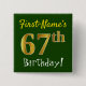 As características deste design quadradas simples do botão uma mensagem gostam do "aniversário nome do 67th! ", com "67th" tendo o falso/imitação ouro-como o olhar da coloração, em um fundo colorido verde. O nome pode ser personalizado. Os botões como estes poderiam talvez ser vestidos por convidados em uma festa de aniversário para alguém que está comemorando seu sessenta aniversários do sétimo, onde o partido está sendo realizado em uma grande área com lotes de outras pessoas atuais (como um parque da cidade ou um parque temático). [~Z0000163]