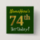 As características deste design quadradas simples do botão uma mensagem gostam de "aniversário NameHere do 74th! ", com "74th" tendo o falso/imitação ouro-como o olhar da coloração, em um fundo colorido verde. O nome pode ser personalizado. Os botões como estes poderiam talvez ser vestidos por convidados em uma festa de aniversário para alguém que está comemorando seu quarto aniversário setenta, onde o partido está sendo realizado em uma grande área com lotes de outras pessoas atuais (como um parque da cidade ou um parque temático). [~Z0000163]