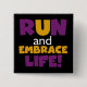 Se você gosta de correr, correr 5Ks, 10Ks, meia maratona, ou maratonas, você vai adorar este design de texto colorido em roxo e amarelo que lê Run and Embrace Life! Corra e Abraça Camisas de Vida, capuzes, ímãs, botões, cartões, adesivos, correntes-chave e muitos outros itens para corredores que adoram um design brilhante e colorido!