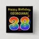Esta design de botão vibrante e divertida apresenta um padrão colorido inspirado em fogos de artifício comemorativos que explodem, juntamente com o número "38", tendo um espectro multicolorido como o arco-íris ou um padrão de gradiente. Ele também apresenta um nome personalizável e uma mensagem de evento, como uma saudação de aniversário de "Parabéns". Um botão como este pode ser vestido pelos participantes numa festa de aniversário que se realiza em comemoração dos trinta e oito anos de alguém. [~Z0000334]