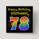 Este design de botão vibrante e divertido apresenta um padrão colorido inspirado em fogos de artifício comemorativos em rebentamento, juntamente com o número "78" com um espectro multicolorido como o arco-íris ou padrão de gradiente. Ele também apresenta um nome personalizado e uma mensagem de evento, como uma saudação de aniversário de "Parabéns". Um botão como este pode ser vestido pelos participantes numa festa de aniversário que se realiza em comemoração dos setenta e oito anos de alguém. [~Z0000334]
