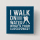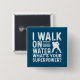 Botão do jogador de hóquei com um ditado humorístico que mostra um texto branco sobre um fundo azul e um jogador de hóquei em silhueta branco. O texto nesta bolsa de jogadores de hóquei diz "Eu Caminho na Água Qual é a Sua Superpotência?"