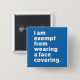 Muitas pessoas estão vestindo máscaras faciais e outros revestimentos para se proteger da COVID-19 e infecções semelhantes; em algumas partes do mundo, há um requisito legal para vestir em certas áreas. No entanto, nem todos podem vestir uma máscara. Algumas pessoas estão isentas por razões de saúde ou outras. Muitas vezes, as crianças beneficiam de isenções. Pessoas com asma, dificuldades respiratórias, ansiedade e muitas outras doenças são também aconselhadas a não vestir máscaras faciais. Esta design pretende tornar isto claro para todos à vossa volta. O texto diz claramente "estou isento de vestir uma cobertura de rosto".