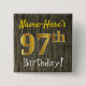 As características deste design quadradas simples do botão uma mensagem gostam do "aniversário Nome-Aqui do 97th! ", com "97th" tendo o falso/imitação ouro-como o olhar da coloração, no falso/fundo de madeira de imitação do teste padrão. O nome pode ser personalizado. Os botões como estes poderiam talvez ser vestidos por convidados em uma festa de aniversário para alguém que está comemorando seu ninety aniversários do sétimo, onde o partido está sendo realizado em uma grande área com lotes de outras pessoas atuais (como um parque da cidade ou um parque temático). [~Z0000167]