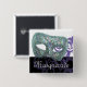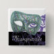 Botão quadrado com uma imagem de rendas roxas sobre preto, uma bela fenda de máscara com fitas de azul, ouro, verde, roxo e fúcsia com cintilação prateada cintilante. Texto personalizável em um script francês prateado. Ver chaveiro de metal de alta qualidade quadrada e colar quadrado. Veja toda a coleção de botões e pinos do Mardi Gras nos TOUCHES ESPECIAIS | Seção Favoritos para festas.